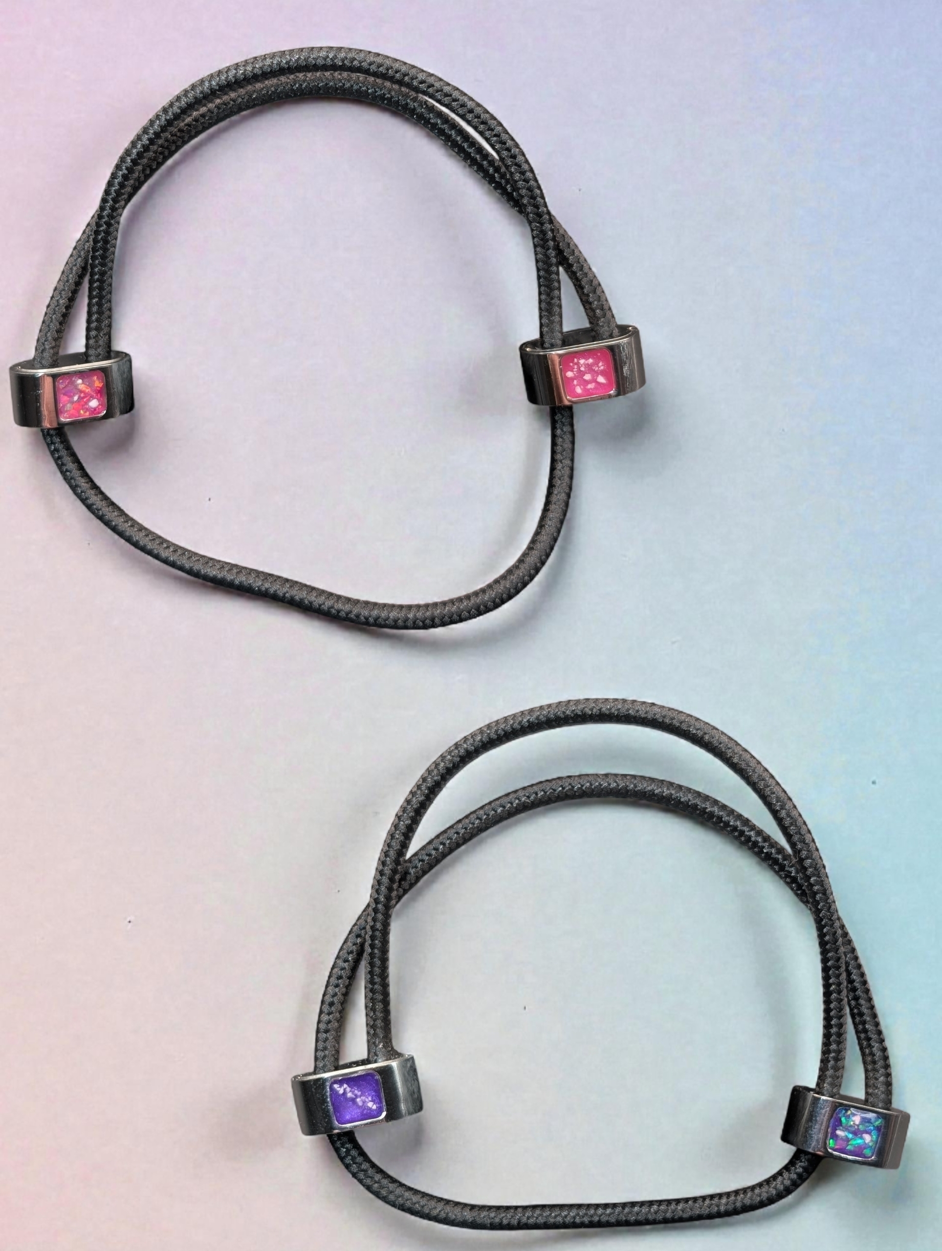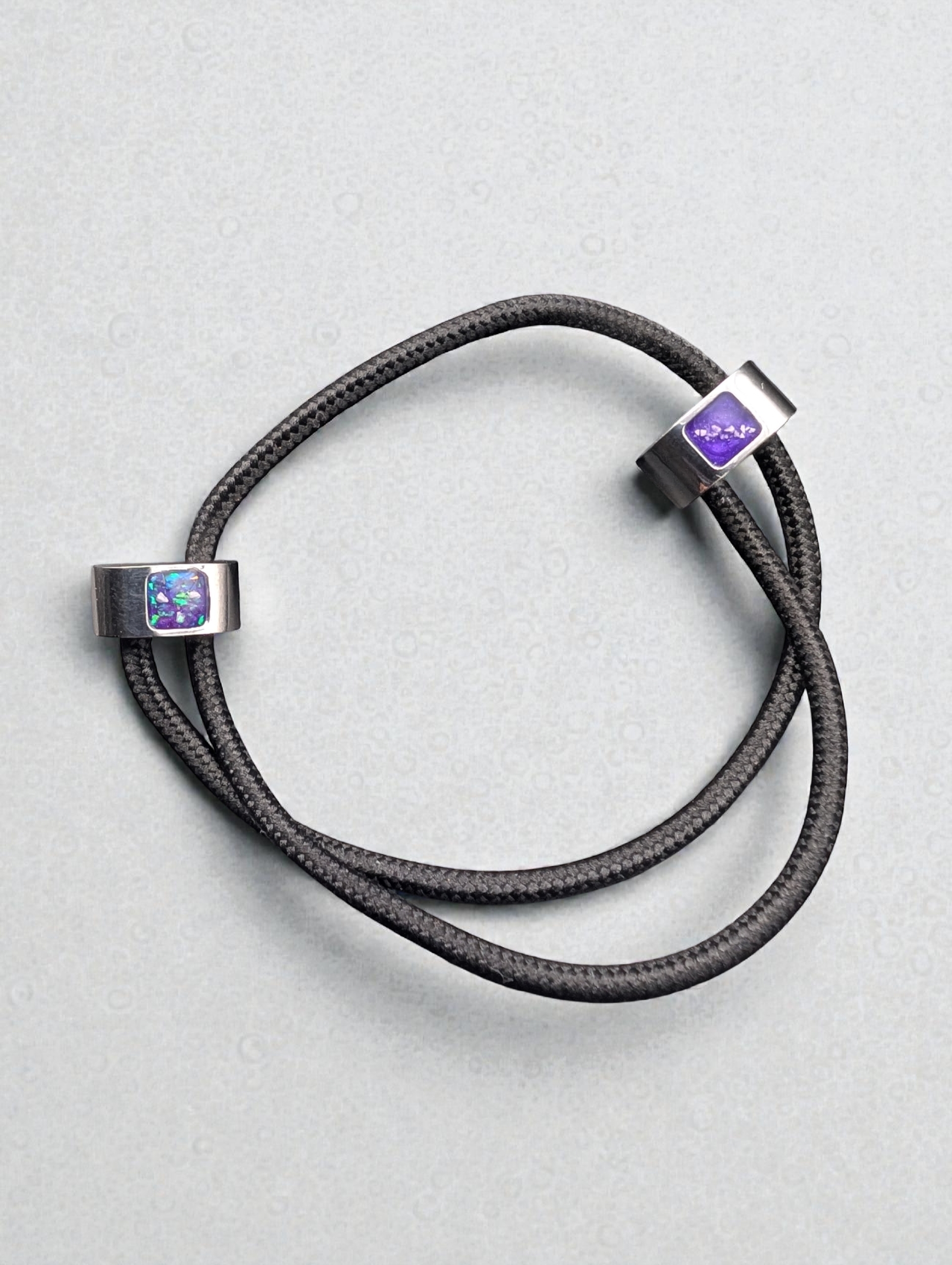 Product: Black adjustable cord bracelet with 2 stainless steel clasps with square shaped recess