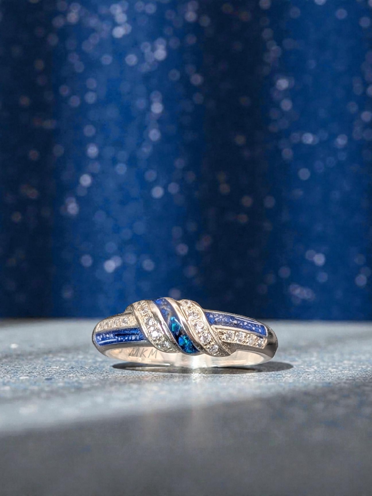 The Moyra Croissant memorial ring features a unique curved design that symbolises connection and continuity. Handcrafted to hold ashes or other inclusions, it creates a beautiful and meaningful keepsake.